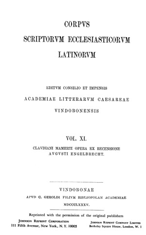 [0] => CSEL 11 – Claudiani Mameriti Opera – ed. August Engelbrecht/REPRINT