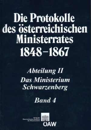 Reihe: Protokolle des Österreichischen MinisterratesBand II/4, Ministerium Schwarzenberg, der Edition „Die Protokolle des österreichischen Ministerrates 1848-1867“ enthält die 101 Protokolle vom 14. 10. 1850 bis 30. 5. 1851 mit textkritischem Apparat, wissenschaftlichem Kommentar, Einleitung und Bibliographie sowie ein Personen-, Orts- und Sachregister. Er dokumentiert den Anfang der politischen Entwicklung, die zum Ende der ersten konstitutionellen Ära in der Habsburgermonarchie geführt hat. Mit der Verfolgung dieses Zieles betraute der Kaiser den ehemaligen Hofkammerpräsidenten Kübeck, einen fähigen Politiker und gewieften Bürokraten. Kübeck sah in der Errichtung des Reichsrates, eines Beratungsorgans, das ausschließlich dem Kaiser unterstehen und ein Gegengewicht zum „verantwortlichen“ Ministerium bilden sollte, das geeignete Mittel. Nach zähem Ringen, das in den Protokollen anschaulich gemacht wird, konnte sich Kübeck durchsetzen und so den Weg für ein Jahrzehnt des Neoabsolutismus ebnen.