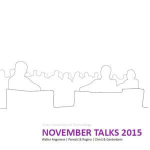 Reihe: November TalksUnter der Leitung und Moderation von Prof. Roger Riewe fanden die Novembertalks in diesem Jahr bereits zum fünften Mal statt. Wieder waren vier international bekannte ArchitektInnen aus Praxis und Lehre aufgerufen, ihre Positionen zur zeitgenössischen Architektur in einem 45-minütigen Vortrag und einer anschließenden Diskussionsrunde darzulegen. Geladen waren Walter Angonese (Kaltern,Italien), Krešimir Rogina (Penezić &Rogina architects, Zagreb, Kroatien) und Christoph Gantenbein (Christ&Gantenbein, Basel, Schweiz).Der Südtiroler Walter Angonese eröffnete die Novembertalks 2015 mit einem kurzweiligen Vortrag, in dem er seine Haltung über das Bauen im ländlichen Raum pointiert vermittelte. Losgelöst von den gegensätzlichen Positionen Design- und folklorischer Tourismusarchitektur bewegt er sich selbstbewußt im Zwischenraum. Dabei reichen die Ansätze seiner Werke von überspitzer Pragmatik mit einer dosierter Portion Ironie bis hin zu stimmungsvoller Architektur zwischen Kunst und Kultur. Krešimir Rogina von Penezić &Rogina architects aus Zagreb setzte die Vortragsreihe mit einem anspruchsvollen Beitrag fort. Ihren fundierten theoretischen Hintergrund leiten Penezić &Rogina aus der Geschichte her. Ihrer Ansicht nach emanzipiere sich Architektur heute vom Raum. Im digitalen Zeitalter müsse Wahrnehmung über das Visuelle hinausgehen und Architektur als abstraktes Medium verstanden werden. Praktisch überzeugte dieser theoretische Ansatz vor allem in den konzeptuellen Projekten von Penezić &Rogina auf der Biennale in Venedig.Den vorläufigen Höhe- und Schlusspunkt der Novembertalks 2015 setzte Christoph Gantenbein von Christ&Gantenbein aus Basel. Das Büro definiert für sich den Begriff der Nachhaltigkeit neu: Es gehe weniger um einen ökologischen Aspekt des Wortes Nachhaltigkeit, sondern vielmehr um Architektur die überdauert und ihren Autor nicht mehr braucht! Sie führt ein Erbe fort, ist zeitlos, anonym, fügt sich in den Kontext, nutzt abstrakte Typologien und einfache, klare Formen. Diese Thesen untermauerte Gantenbein mit einer Reihe von so überzeugenden und beeindruckenden Projekten, dass dieses junge Büro wohl kaum im ausgeführten Sinn „anonym“ bleiben wird.Die Publikation in Form einer Broschüre fasst die Transkriptionen der Diskussionsrunden, sowie Darstellungen ausgesuchter Werke der ArchitektInnen zusammen.Ein besonderer Dank ergeht an die Sto-Stiftung für die großzügige finanzielle Unterstützung der Novembertalks.