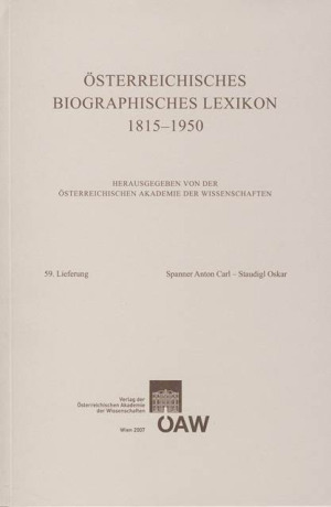 Serie: Österreichisches Biographisches Lexikon 1815-1950Das Österreichische Biographische Lexikon erfasst als einziges Kompendium dieser Art bedeutende Persönlichkeiten, die auf dem jeweiligen österreichischen Staatsgebiet geboren wurden, gelebt oder gewirkt haben und zwischen 1815 und 1950 verstorben sind. Bestimmend für die Aufnahme ist eine außergewöhnliche Leistung auf irgendeinem Gebiet, in Wissenschaft, Politik, bildender oder darstellender Kunst, Literatur, Sport, in der Verwaltung oder im Vereinswesen. Es sind vor allem die weniger Bekannten und Vergessenen, die man sonst in Lexika vergeblich sucht, denen das besondere Augenmerk gilt. Die 59.Lieferung erfasst in 254 Biographien und 29 Miterwähnungen u.a. Persönlichkeiten wie den Tiroler Landesverteidiger Josef Speckbacher, den Botaniker Otto Stapf, den Wiener Stadtphotographen August Stauda, die Historikerin Käthe Spiegel oder die Fürstin Franziska (Fanny) von Starhemberg.