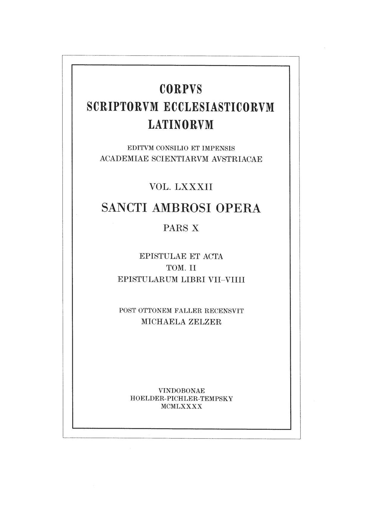 Reihe: Corpus Scriptorum Ecclesiasticorum LatinorumAmbrosius: Epistulae et acta, epistularum libri I-VI (ed. O. Faller 1968). Post Ottonem Faller recensuit Michaela Zelzer