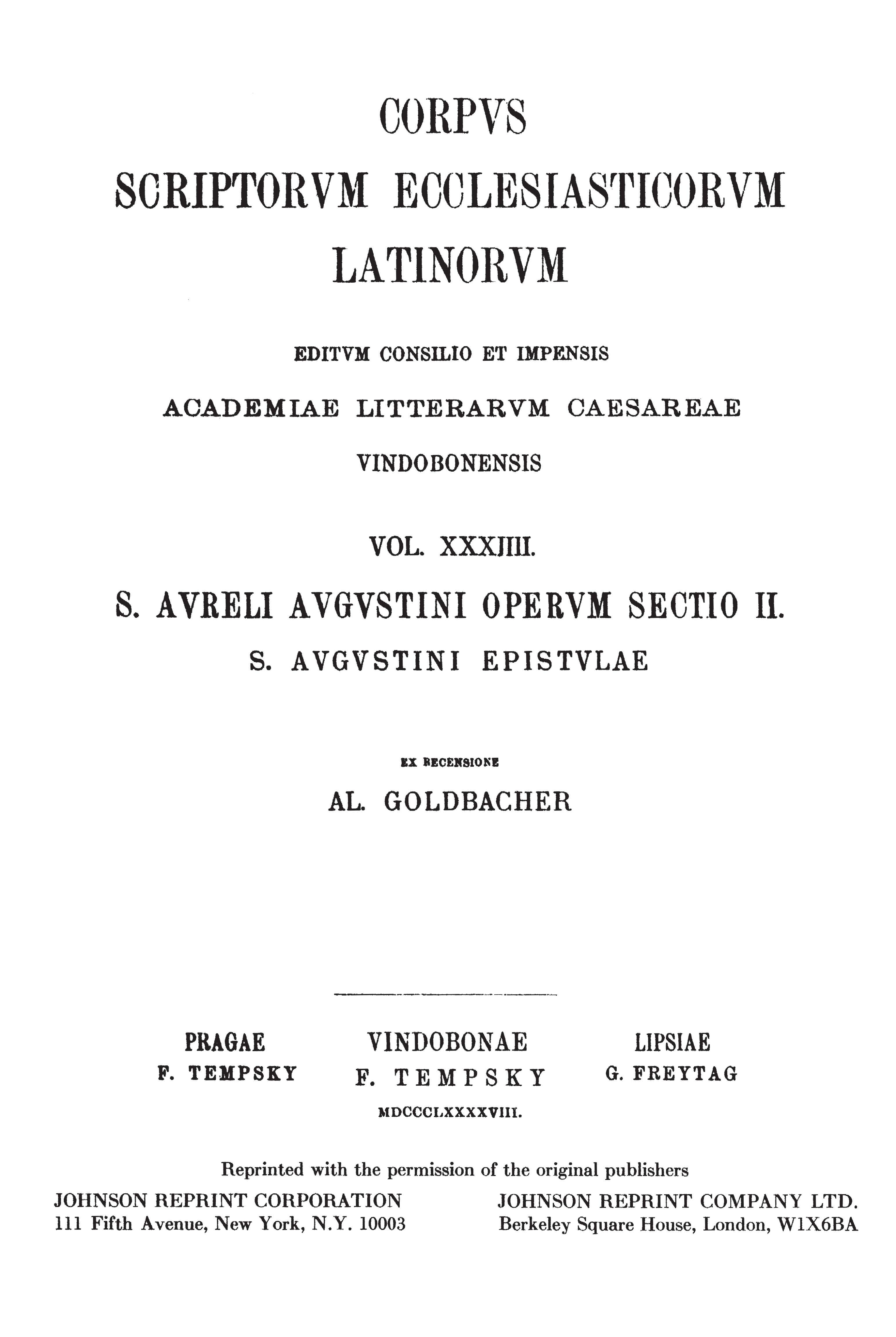 Reihe: Corpus Scriptorum Ecclesiasticorum LatinorumAugustinus: Epistulae (ep. 31-123) (ed. A. Goldbacher 1898). Recensuit et commentario critico instruxit Al. Goldbacher